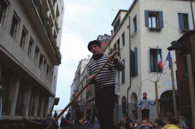 一大早,大家赶着来到威尼斯大运河边。我们将乘船从威尼斯大运河进入威尼斯城。今天,天阴阴的,风很大,船还没来,能见度也不是很好。因为是淡季,在河边等船的团员不是很多,往常到了四五月份旺季,来威尼斯的人会很多。一条小船来了,大概能搭三四十人。行船大约40分钟,威尼斯水城终于到了。上了水城,一定要去水巷坐威尼斯的贡多拉。如果到了威尼斯,你不坐贡多拉,就失去意义了。贡多拉由意大利黑手党经营,由质地坚硬的黑檀木制造的。每只贡多拉造价7万美金,可坐六人,由穿着黑白条纹水手服的船老大摇橹撑船,船老大是地道的意大利人,他愉快地轻哼起口哨,带着我们慢悠悠地滑向水巷。水巷窄窄的,房子常年浸泡在河水中,水下的橼木桩子一旦腐烂,我们下一辈的下一辈的下一辈,就有可能看不到威尼斯水城了。威尼斯天上鸽子很多,这就是为什么很多人晴天仍撑着伞的缘故。贡多拉穿梭在水巷当中,你仿佛就在大街小巷中逛街,很惬意。游完水巷,“船长”(我们六人自己选的)要给船老大2欧元小费。在欧洲,既然你来了,就要适应给小费的习惯。那样你得到的服务跟笑容,会是木姥姥多的*^^*。