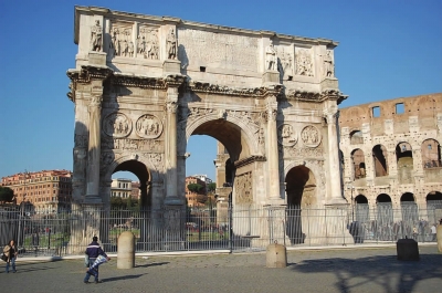 来到罗马,不可能不去古罗马角斗场。我们所见虽是一个断壁残垣的废墟,但从侧面仍可想见当年的恢弘。角斗场共有三层,从下到上的石柱渐渐变得细小,外围拱形的大门异常漂亮,庄重而协调,壁上残破的孔是原来安装铁加固件后留下的痕迹。看着这些,凭着想象,仿佛依稀还能听到当年古罗马人观看人与人、人与兽、兽与兽血腥杀戮、撕咬与嘶喊的场面,听到万众山呼的狂热……旁边的君士坦丁凯旋门,当年是为了纪念罗马帝国皇帝君士坦丁打了胜仗而建造的,它庄严而壮观,后来拿破仑看到了非常喜欢,想把它搬到法国去,但是操作性不强,于是就在巴黎仿造了一个。